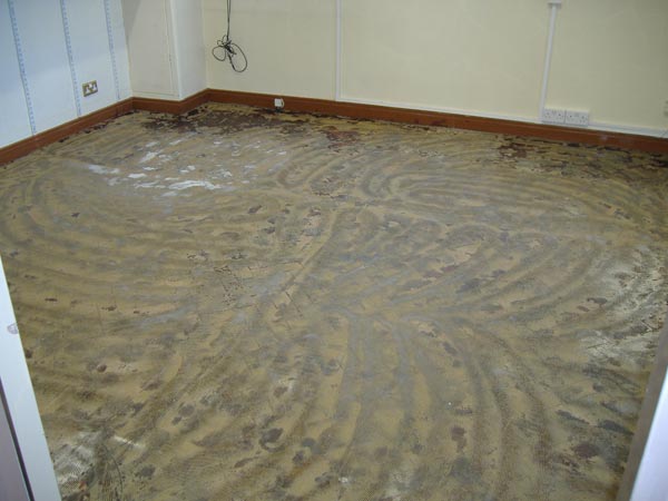 The carpet tiles that had been removed from this office floor had left behind an extremely thick layer of adhesive, this had to be removed with a 16 grit extra rough sanding belt, once removed normal sanding with finer papers was resumed.